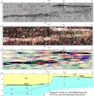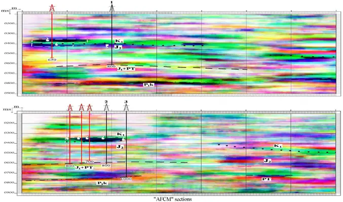 – To single out zones, where reservoirs and impermeable beds are developed. For these goals, the sections of “AFCM” (amplitude-frequency characteristic of medium) are used, which are characterized by important and distinctive feature: the calculation of colour instead of it’s assignment. Changing of the colour on the “AFCM” sections shows that the reservoir characteristics of the section change. In the given variant of calculation, horizons of the reservoirs are displayed on the “AFCM” sections in dark blue and black colour. The efficiency of this methodology is proven on a number of structures and fields connected to various types of sections. On the presented “AFCM” sections, four boreholes (red colour) are shown, which were drilled with the help of our recommendations and have given the production in terrigenous section.