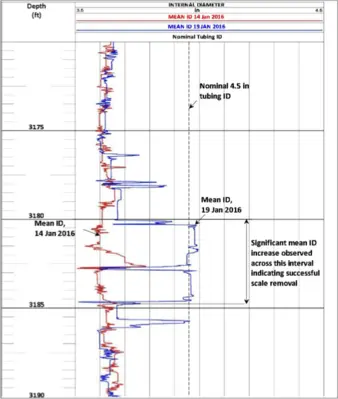 The post-treatment caliper log was then acquired, confirming that the scale was removed from the tubing (see figure at right). The scale was approximately 0.36 inches thick.